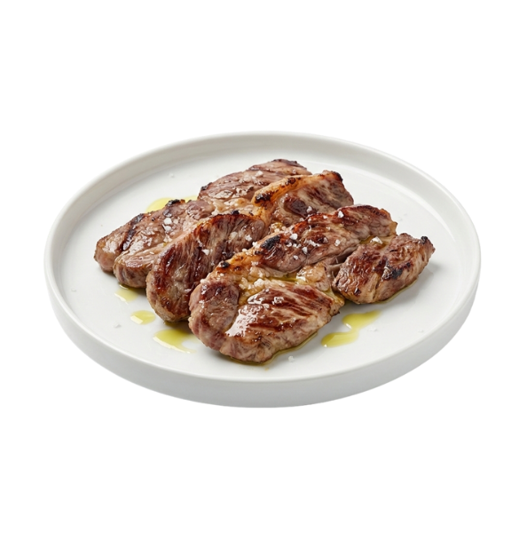 Secretos de porco preto grelhados, uma carne suculenta e marmoreada, temperada com flor de sal e azeite de qualidade. O sabor genuíno do Alentejo.