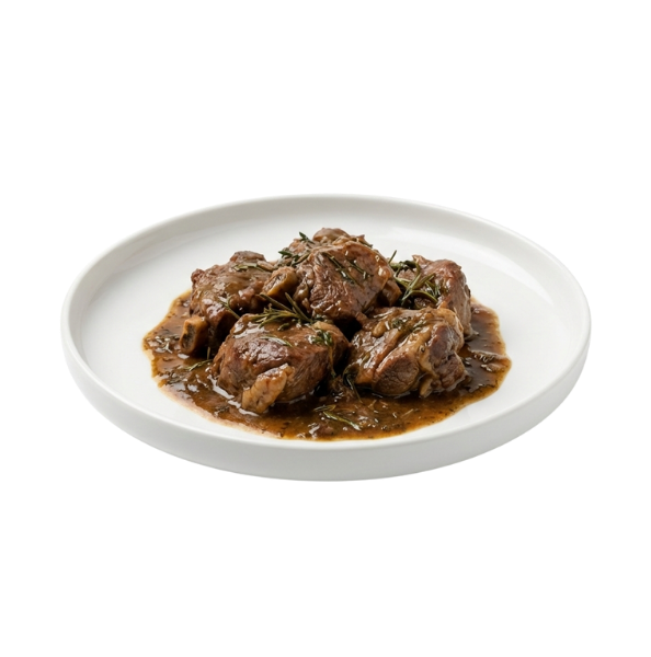 Borrego tenro cozinhado lentamente em lume brando, envolto num molho rico e aromático com ervas do campo. Servido sobre fatias de pão caseiro.